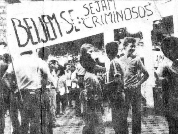 A reação, capitaneada pela juventude local, foi imediata. E um protesto foi organizado boca a boca – não estou pretendendo fazer trocadilho algum, mas ainda não existia a internet – e cerca de cinco mil jovens se mobilizaram. Com cartazes incentivavam que todos fossem para praças e ruas, na noite seguinte, para um grande “beijaço”. Desta forma, não haveria nem forças policiais nem cadeia suficiente para deter e prender tantos “criminosos”. Num muro do centro surgiu uma pichação com a frase “O beijo é uma coisa iMoralles, não é mané?”. No horário marcado estavam lá entidades universitárias, representações sindicais, grupos de teatro e muita gente sem identificação, que simplesmente aderiu à causa. Uma passeata pacífica cruzou as ruas, até o ponto marcado, junto à Praça do Canhão. Então rolaram os beijos combinados, mas também muita pancadaria, porque policiais, tanto identificados como disfarçados que se infiltraram antes, buscaram cumprir a ordem judicial, impedindo “a desordem e falta de vergonha”. Viaturas começaram a circular pelo meio do povo, em grande risco à integridade de todos. Cada um que era detido tinha que apresentar seus documentos e se explicar, como se precisasse.