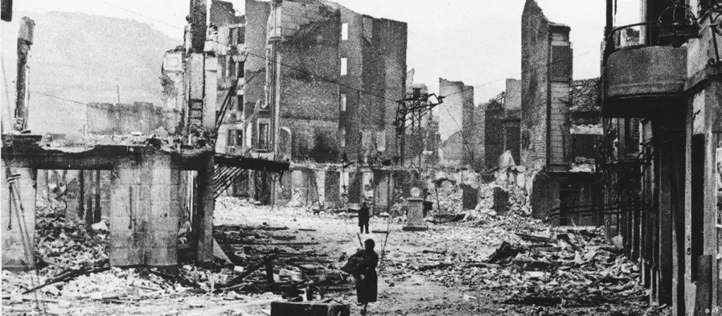 O homem mostrou a ele uma foto da obra chamada Guernica – queria saber sobre ela –, a enorme pintura na qual Picasso retrata visão sua sobre o bombardeio que havia sido perpetrado sobre a pequena cidade que tem aquele nome e fica em território basco. O fato se deu durante a Guerra Civil Espanhola, em 26 de abril de 1937. Com autorização do grupo de Francisco Franco, fascista que buscava chegar ao poder pela força na Espanha, aviões da Legião Condor, da Alemanha, destruíram o pequeno povoado, matando 1.654 e deixando centenas de feridos, entre os pouco mais de cinco mil habitantes.