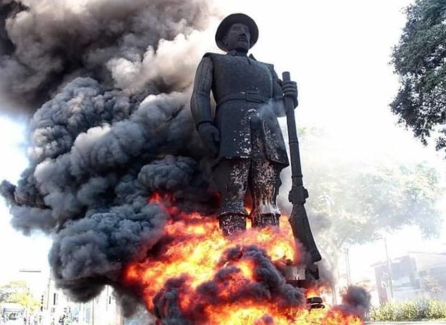 Aquele paulista “cidadão de bem” teve uma estátua sua como alvo de um incêndio praticado pelo grupo de resistência Revolução Periférica. Entre 25 e 30 pessoas participaram do ato, praticado em julho, depois que panfletagem sua protestando contra a existência de tal homenagem não surtiu efeito algum. Um casal foi identificado como líder da ação. São eles o entregador de aplicativo Paulo Roberto da Silva Lima, conhecido como “Galo”, e sua esposa Géssica. Ele se apresentou voluntariamente à polícia e admitiu participação. Teve prisão preventiva decretada. Dias depois, quando o Superior Tribunal de Justiça concedeu habeas corpus, para que não fosse cumprida a determinação judicial houve a transformação em prisão preventiva, de forma arbitrária.