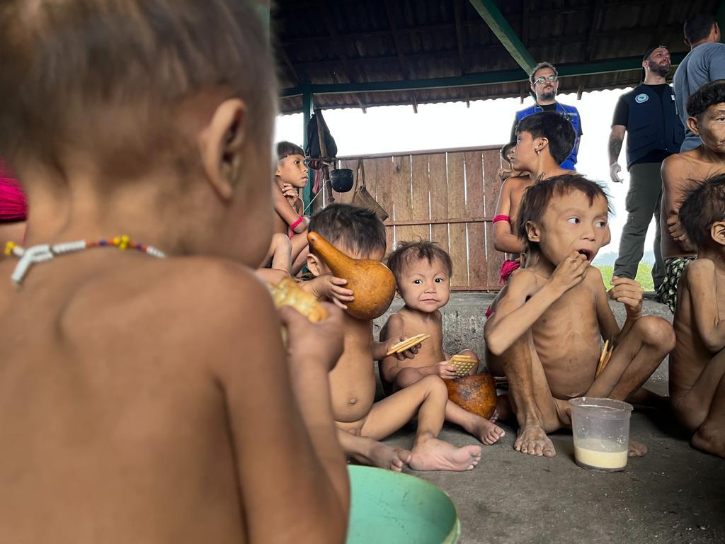 Equipe do Ministério da Saúde levou alimento para os pequenos yanomamis