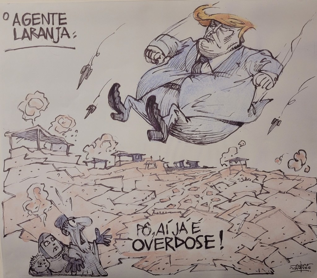 Esta exposição é quase que a continuação de outra que esteve no local em janeiro de 2024: Sinta-se em Gaza. Eram 20 os cartunistas no ano passado. Daqueles, nove estão outra vez expondo agora, na companhia de outros nove que fazem sua “estreia” não na carreira, mas no tema proposto coletivamente. As obras são individuais, exceto por uma que é uma espécie de painel – este, ao estilo da mostra itinerante Nau dos Insensatos, sobre os responsáveis pela tragédia que foi a enchente de maio passado, no Rio Grande do Sul. Os nomes de ambas as que tratam de Gaza foram sugeridos por Edgar Vasques, 75 anos, que entre outros feitos foi o criador do impagável Rango.